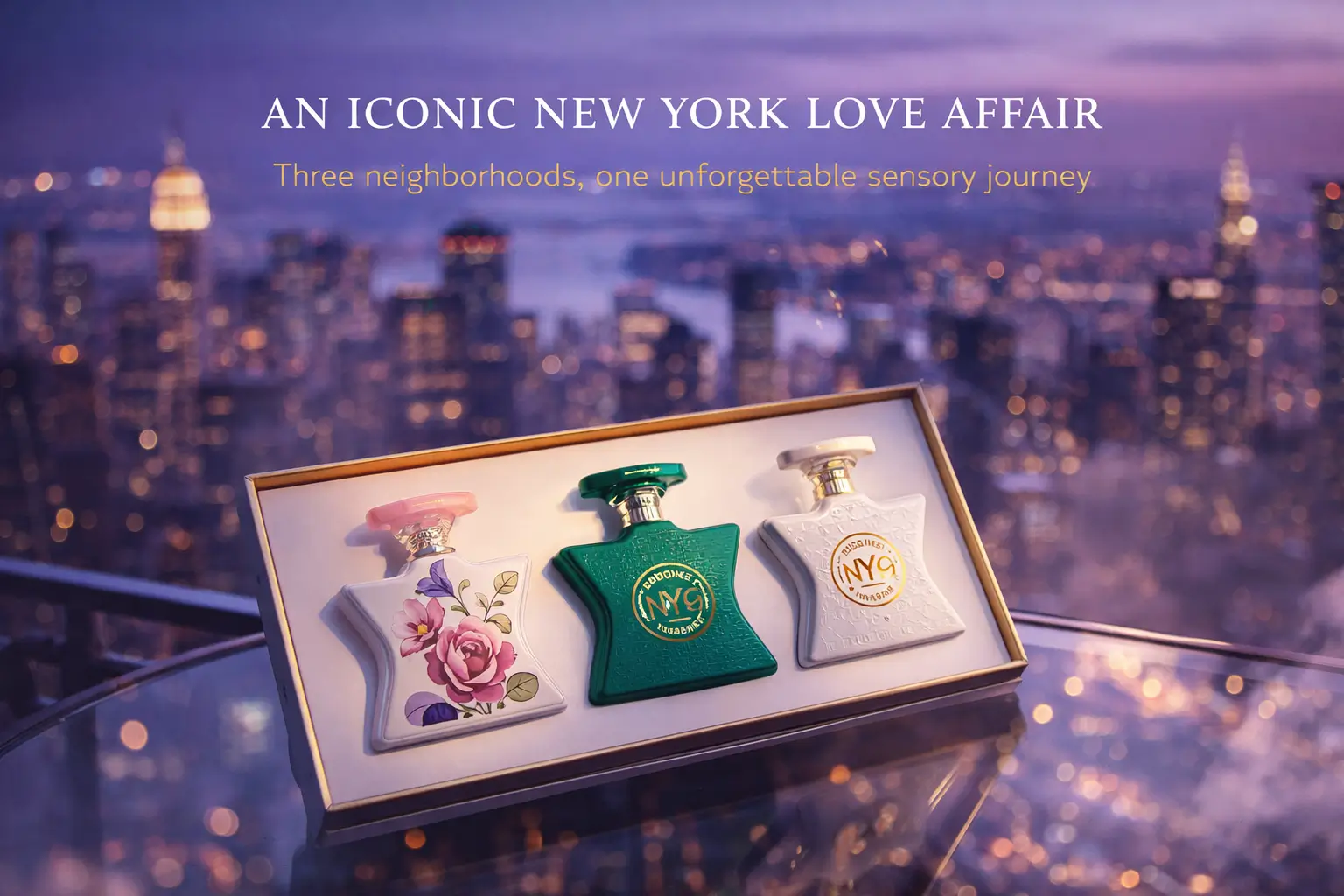 A stunning luxury perfume trio featuring three iconic Bond No. 9 silhouette bottles