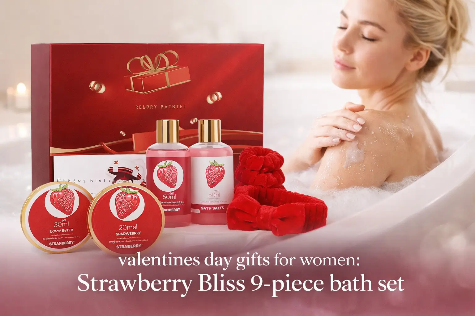 valentines day gifts for women — 9-piece Strawberry Bliss bath set in a premium box with shower gel, bubble bath, body butter, salts and spa extras.